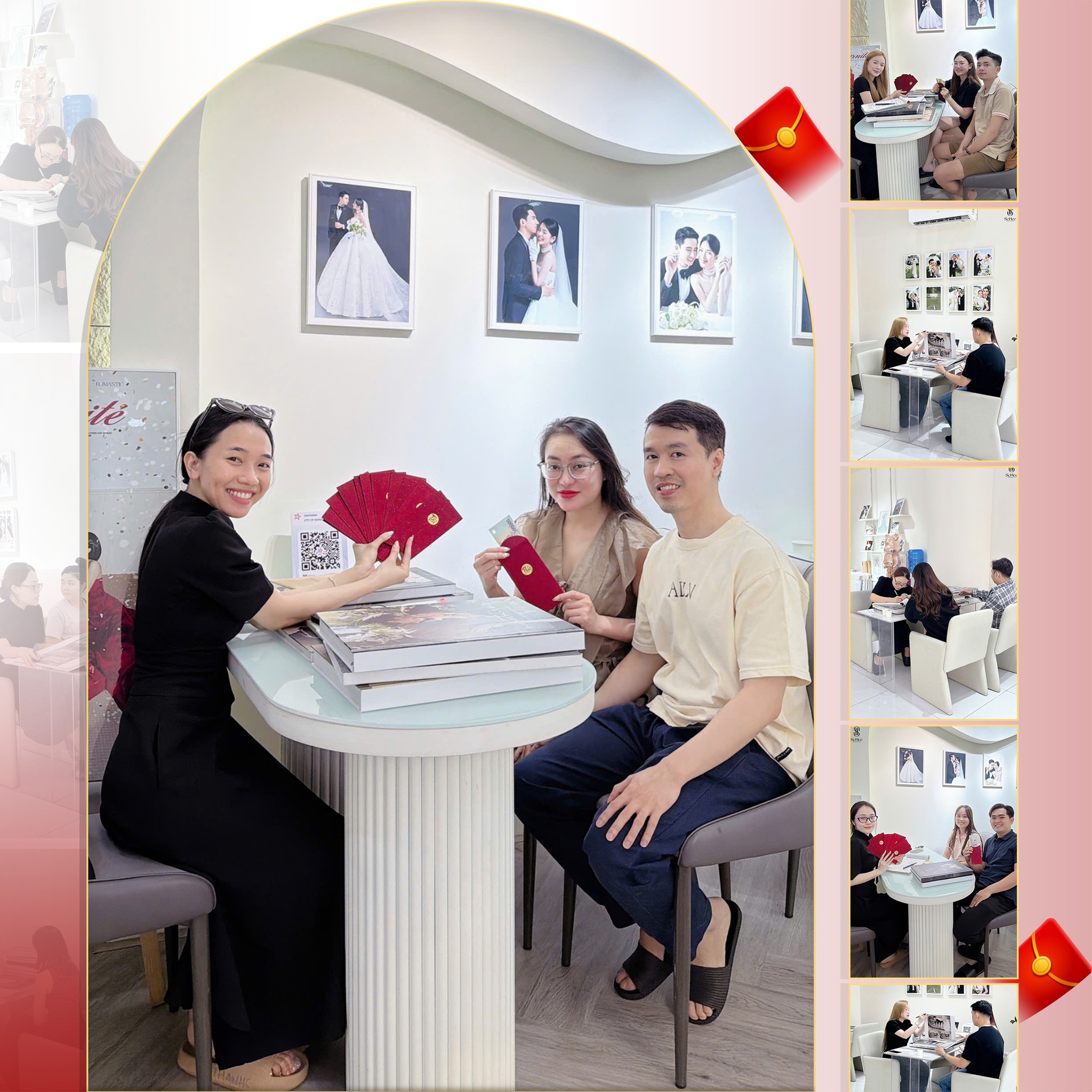 Bối cảnh được thay đổi linh hoạt, từ phông nền trơn hiện đại đến góc phòng khách, cửa sổ lớn hay backdrop hoa nhẹ nhàng. Mỗi khu vực đều được tính toán nhằm đảm bảo tính thẩm mỹ và sự đồng bộ về phong cách.