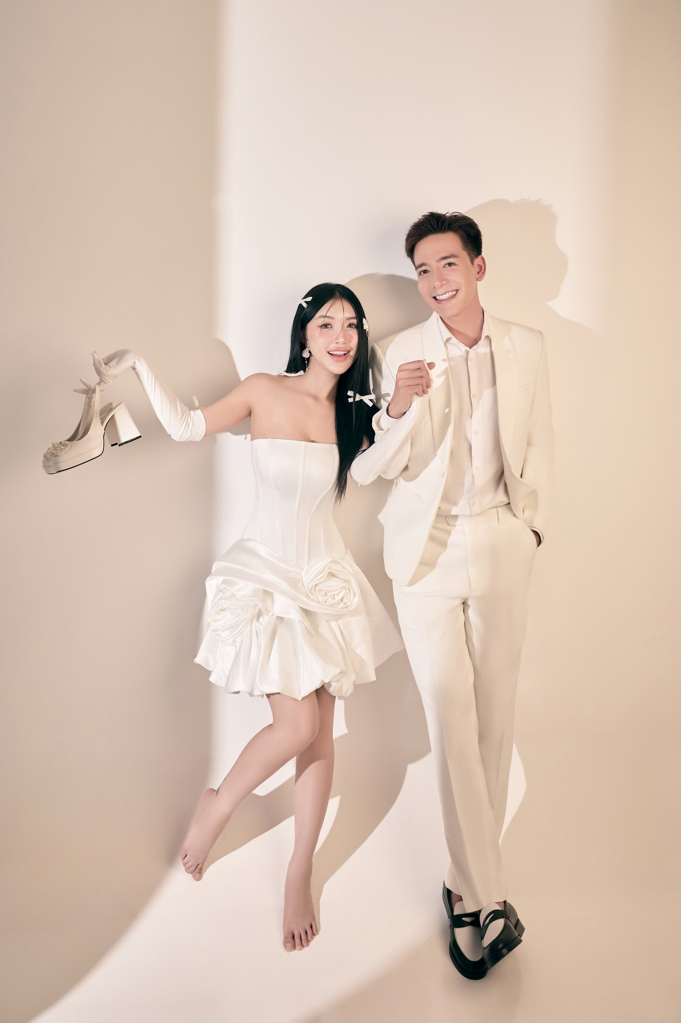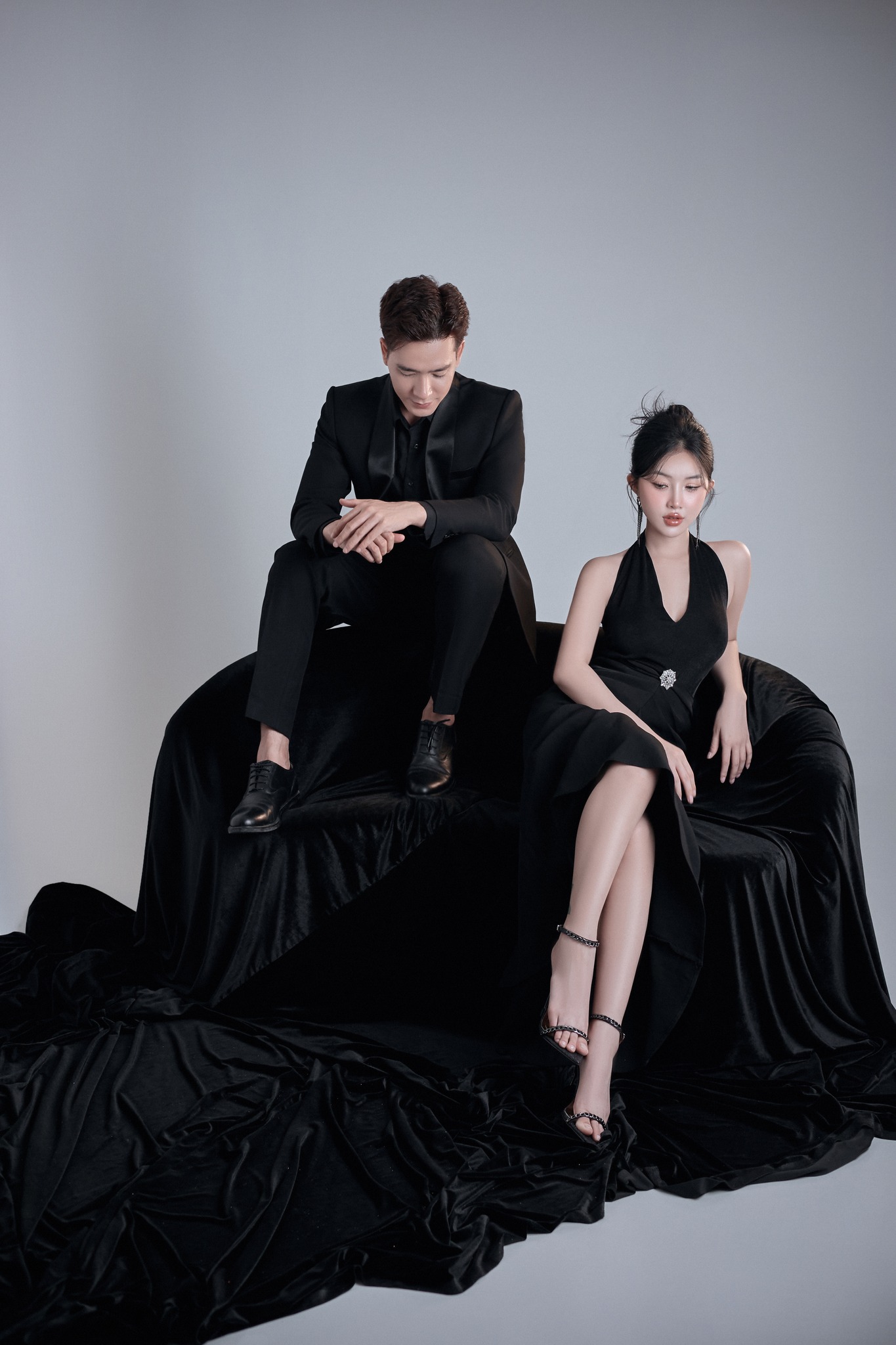 Với ảnh cưới phông trơn, trang phục đóng vai trò rất lớn. Nên ưu tiên những thiết kế tinh giản, đường cắt gọn gàng để tổng thể không bị rối mắt. Phụ kiện vừa đủ sẽ giúp tạo điểm nhấn mà không làm mất đi tinh thần tối giản.