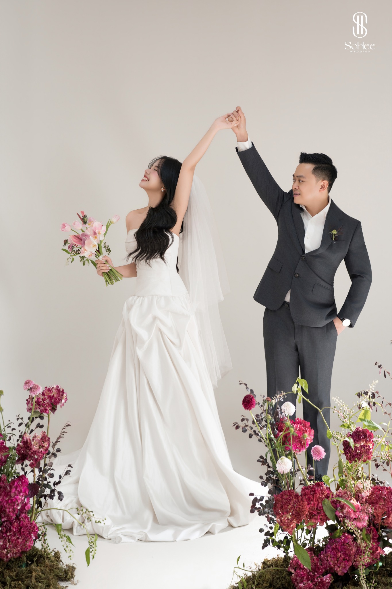 Không cần quá nhiều đạo cụ hay bối cảnh, chỉ cần một background đơn giản cùng cảm xúc chân thật là đủ để tạo nên một bộ ảnh đầy tinh tế. Đây cũng là phong cách được nhiều cặp đôi tại SoHee Wedding lựa chọn vì tính bền vững theo thời gian.